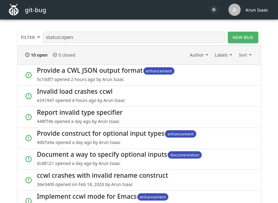 Your collaborators can now git bug pull to fetch the latest issues. You can quickly simulate this yourself with a fresh clone of your repo somewhere. The first time around, you (or your collaborators) have to create a new git-bug user. Then, you run git bug pull followed by git bug webui to interact with the issues.